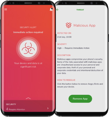 Nuestra solución de seguridad móvil lo protege contra estas aplicaciones inseguras a través de una combinación de reputación de aplicaciones y escaneo de datos personales sin cifrar, como números de tarjetas de crédito, contraseñas, etc. Si los datos personales se envían sin cifrar o existen otros problemas de seguridad, se le notificará de inmediato a través de un notificación en la aplicación. Luego puede eliminar la aplicación para asegurarse de que sus datos personales no se usen incorrectamente.